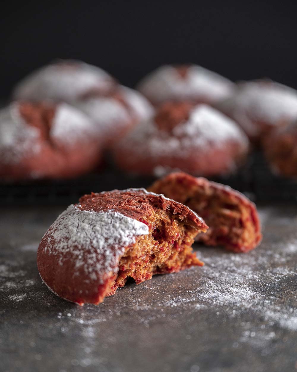 Die Rote Bete Brötchen zunächst 30 Minuten bei 210 °C Ober- und Unterhitze backen. Dann die Temperatur auf 220 °C erhöhen und die Brötchen weitere 10 bis 20 Minuten backen (je nach Größe der Teiglinge). Wir haben sie herausgenommen, als die Krume mittel- bis dunkelbraun geworden war.