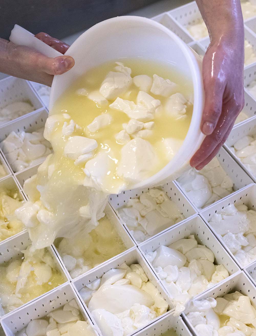 In der Käserei beginnt das Verschöpfen. Es ist wieder eine Arbeit mit der Zeit. Maximal 25 Minuten dürfen vergehen, bis Karo die Bruchstücke in die Formen gefüllt hat, denn die Dickete zieht sich weiter und weiter zusammen und wird fest. Mit der Schöpfkelle hebt Karo eine Portion Dickete aus dem Kessel, schwingt sie über die Formen und schüttet nach Gefühl das richtige Maß der knubbeligen Mäuse hinein. Aus den Löchern, die in die Formen hinein perforiert sind, fließt die Molke ab.
