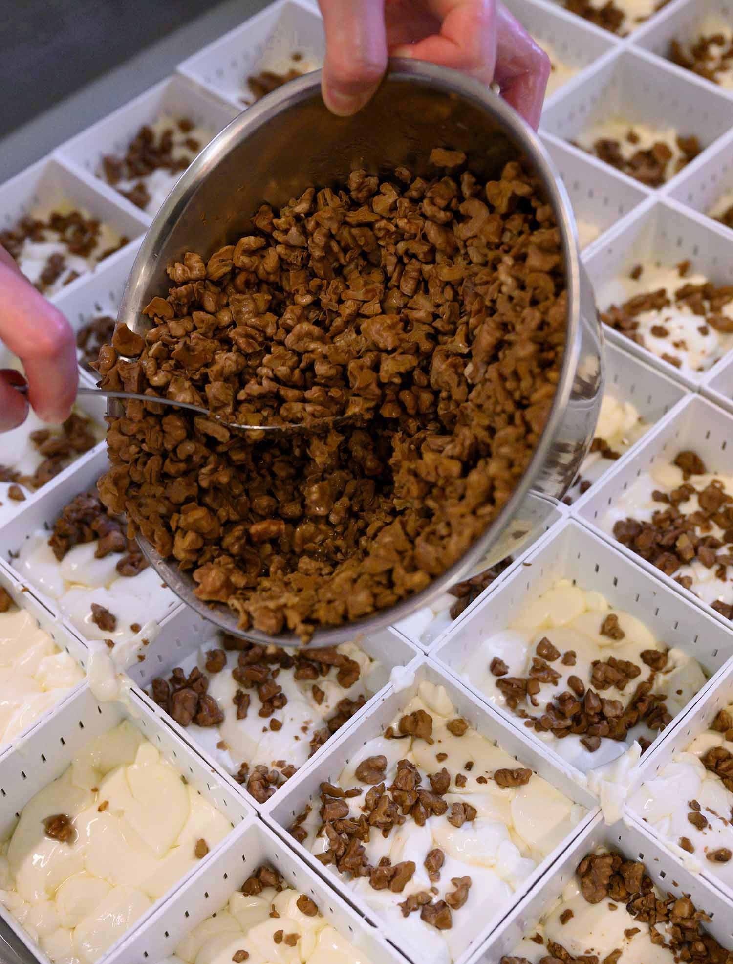 Morgens ist Karos „Ruhe-Zeit“, wie sie sagt. Sie liebt die Stille, die Dunkelheit, das Morgengrauen, und geht die Sonne auf, hat sie bereits viel geschafft. Nüsse vorgekocht, Milch geschüttet, Molke abgelassen, Bakterien gewogen, Bakterien geschüttet, Lab eingespritzt, gelabte Milch gerührt, Haut abgenommen, gekühlt, Wasser abgelassen. Es klingt so harmlos, doch es ist eine Frage des exakten Timings, des Fingerspitzengefühls, der fließenden Prozesse, einer routinierten Hand-in-Handarbeit mit sich selbst. Jeder Griff muss sitzen, jede Temperatur auf ein Mü abgestimmt sein, alles andere verzeiht einem das Milchprodukt nicht.